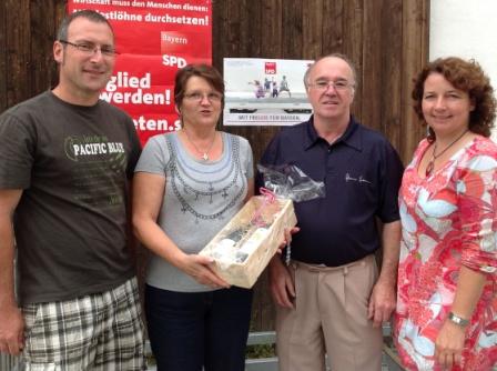 Der SPD-Vorsitzende Thomas Niederreiter bedankte sich bei Rosi Wolf auch für ihre langjährige Bereitschaft, einen ihrer Urlaubstage für die Fossiliensuche im Rahmen des Ferienprogramms zu verwenden. Stets sei Rosi die „gute Seele“ am Bus gewesen, die die hungrigen Hobby-Archäologen mit Wurst- und Käsesemmeln, Getränken und Äpfeln versorgt habe. „Euer Engagement verdient höchste Anerkennung und wir lassen Euch nur ungern gehen“, so Niederreiter. Doch auch in der neuen Heimat gebe es einen SPD-Ortsverein, der sich über engagierte Neuzugänge freue, waren sich die beiden Vorsitzenden Thomas Niederreiter und Ruth Müller einig. Mit einem Weinpräsent bedankten sich die beiden bei Rosi und Ludwig Wolf und luden sie ein, das alljährliche Torbräufest in Pfeffenhausen auch künftig im Terminkalender zu behalten, um so die alten Kontakte und Freundschaften zu pflegen.