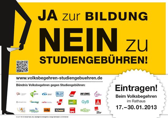 Am 17. Januar startet das Volksbegehren "Nein zu Studiengebühren in Bayern" - 940.000 Menschen müssen sich innerhalb von 14 Tagen in ihren Rathäusern eintragen, damit es zum Volksentscheid kommt. Heute haben wir im Gemeinderat - nach einem gemeinsamen Antrag von SPD & FW - die Öffnungszeiten festgelegt: