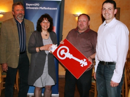 Aus der Hand des SPD-Ortsvorsitzenden Martin Kreutz aus Mallersdorf konnten für die SPD Pfeffenhausen Arno Wolf und Ruth Müller den symbolischen Schlüssel für die virtuelle Geschäftsstelle des SPD-AK Labertal entgegen nehmen. Der 2008 von Rainer Pasta und Ruth Müller gegründete SPD-Arbeitskreis Labertal umfasst nun 14 Ortsvereine in 5 Landkreisen und die Koordination der Aktivitäten dieser Ortsvereine erfordert eine gewisse Organisationsstruktur.
