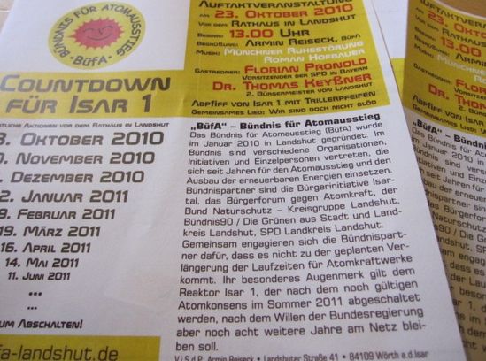 Nach der Aktions- und Menschenkette in München beteiligt sich nun der SPD-Ortsverein Pfeffenhausen auch an der Auftaktveranstaltung der BüfA (Bündnis für Atomausstieg) am Samstag vor dem Landshuter Rathaus. Zahlreiche Bündnispartner – unter ihnen auch die SPD - engagieren sich dafür, dass es nicht zu der geplanten Verlängerung der Laufzeiten für Atomkraftwerke kommt.