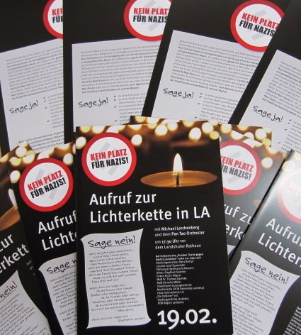 Unter dem Motto „Kein Platz für Nazis“ veranstaltet der „Runde Tisch gegen Rechts“ die Lichterkette. Ab 17.30 Uhr ist Treffen vor dem Rathaus – der bekannte Schauspieler Michael Lerchenberg wird als Redner erwartet und das überregional bekannte „Pan Tao Orchester“ wird gegen „rechtes Gedankengut trommeln“. Rechtsextremismus ist der wohl deutlichste Widerspruch zu Menschenwürde, Freiheit und Demokratie. Die Mitglieder des SPD-Ortsvereins beteiligen sich an dieser Veranstaltung, um zu zeigen, dass diese Weltanschauung nie wieder einen Nährboden in Deutschland finden darf.