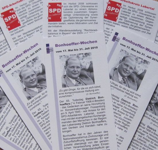 "65 Jahre Kriegsende im Abens- und Labertal und Ermordung Bonhoeffers" - unter diesem Motto stehen die nächsten Wochen der SPD-Ortsvereine und der evangelischen Kirchen im Labertal. 2009 organisierte der SPD-AK Labertal in einer Gemeinschaftsaktion die Ausstellung "Rechtsradikalismus in Bayern" der Friedrich-Ebert-Stiftung in fünf verschiedenen Schulen und 4 verschiedenen Landkreisen, was eine hervorragende Resonanz fand. Für 2010 wollte man eine ähnliche Aktion starten und wieder in vier bis fünf Gemeinden eine Ausstellung organisieren. Nach vielen Telefonaten ist es der SPD-Kreisvorsitzenden Ruth Müller im Dezember 2009 gelungen, die Bonhoeffer-Ausstellung aus Hamburg, die in den nächsten Tagen auf dem ökumenischen Kirchentag zu sehen ist, erstmals nach Niederbayern zu holen. Gemeinsam mit den SPD-Ortsvereinen und den evangelischen Kirchen im Laaber- und Abenstal ist nun vom 17. Mai bis 31. Juli die Ausstellung zu sehen, die von vielen Begleitveranstaltungen umrahmt wird.