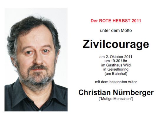 Der bekannte Autor Christian Nürnberger wird der Referent des Abends sein. Nürnberger ist als Autor der Bücher „Mutige Menschen“ bekannt geworden. Zum einen beschreibt er jeweils 12 Biographien von Menschen, die ihr Leben für eine gute Sache eingesetzt haben – sind es einmal Freiheit und Menschenrechte, ist es ein andern mal der Widerstand gegen das NS- Regime. Prägend sind aber die Begleittexte zu seine Büchern, in denen er der Frage nachgeht, „wie mutig bin ich eigentlich“. Er befasst sich mit den Hintergründen, die den einen zum Helden werden lassen, den anderen aber zum Täter.