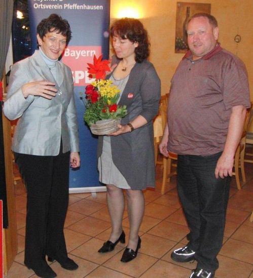 Eine kurze Aussprache schloss sich dem Referat von MdL Inge Aures an. Kreisrätin Ruth Müller äußerte ihr Unverständnis, dass man 300 Referendare sang- und klanglos abserviere und hier Hunderte von Millionen Zinsen den Banken nachwerfen müsse. Der Sprecher des SPD-Arbeitskreises Labertal, Rainer Pasta, schloss die Versammlung. Die Referentin wurde von Ruth Müller und Rainer Pasta mit einem Blumenpräsent und einem roten Windradl verabschiedet, das dazu beitragen soll, Bayern "auszulüften".